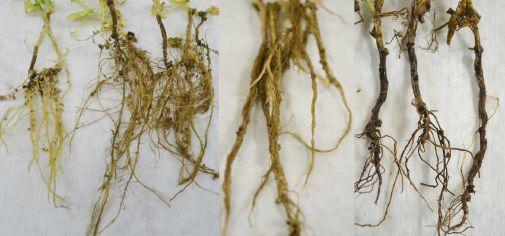 Fusarium root rot tends to cause blackening of the tap root and it doesn’t usually extend into the lateral roots. Instead, in the field, we were seeing roots that were totally decayed, often with complete loss of the lateral roots along with honey-brown and black discolouration.