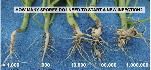 In our research, we looked at the number of oospores per gram (oospores/g) of soil. At low levels, the pea plants were pretty healthy, but at 100 the plants looked very diseased. One hundred oospores isn’t good news because that’s a very low threshold level.