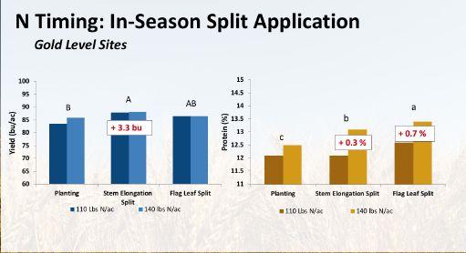 Looking at application timing, split rates were applied with 80 pounds N at planting plus 30 or 60 pounds at stem elongation or flag leaf. These were compared to equivalent rates of 110 or 140 pounds applied entirely at planting. At the Gold-level sites under a moister growing environment, there was a 3.3 bushel yield per acre advantage with a split application at the stem elongation stage. Deferring part of the N application until stem elongation increased protein by 0.3 per cent and deferring part until flag leaf resulted in 0.7 per cent higher protein.