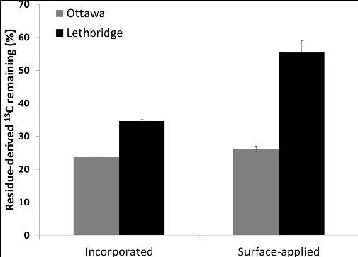 In Lethbridge, less residue remains when incorporated, whereas in Ottawa, incorporation makes less of an impact on the decomposition of residue.