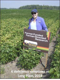Megan Bourns, in her U of M Masters research project in 2018 and 2019, looked at K fertilization of soybeans on K deficient soils. Potassium deficiency symptoms were observed throughout the growing season. However, she found no yield response to any K treatment at any site. But barley planted on the same sites showed a 20 per cent increase in yield where soybean showed none. This indicates that the current recommendations based on soil test K work well for barley but not soybean.