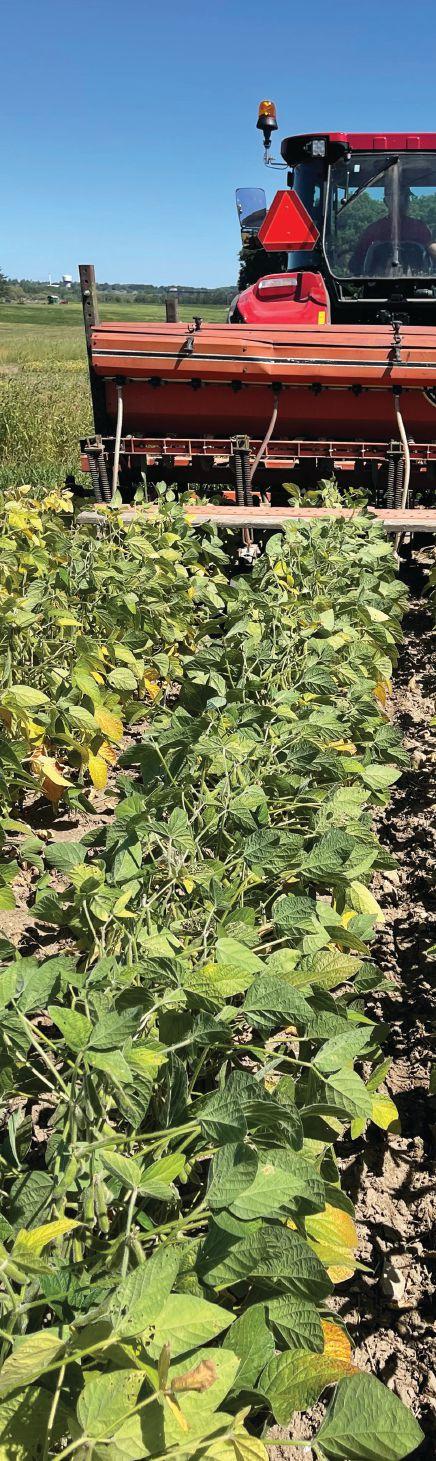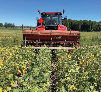According to DeGier, the project team has put a lot of thought into ensuring that equipment operations for one relay crop do not damage the other relay crop. For instance, at the Elora and Woodstock locations, in the forward relay, they have retrofitted a seed drill so they can plant the soybeans on 30-inch centres without running over the canola rosettes. And they use narrow-wheeled tires to move between the rows in both relay systems.