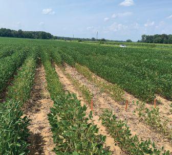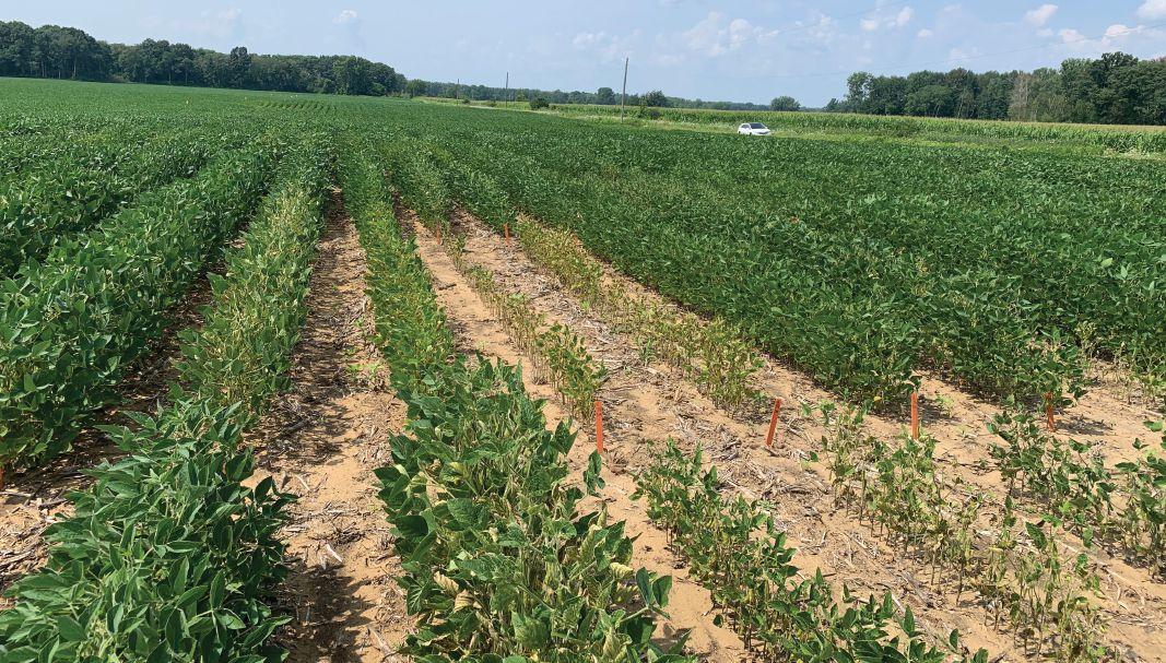 ABOVE: SDS-susceptible soybean lines compared to resistant lines in one of Eskandari’s field locations.