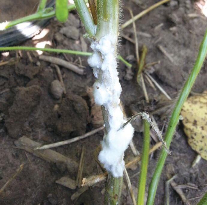 White mould, also called sclerotinia stem rot, is a soil-borne disease caused by the fungal pathogen Sclerotinia sclerotiorum. The fungus overwinters in the soil as resting bodies called sclerotia, which can survive for up to seven years in the soil. In the spring, the sclerotia produce apothecia, which are little golf tee-shaped mushrooms. The apothecia release millions of tiny spores into the air. The spores can colonize soybean flowers and use them as an energy source to infect the plant’s stem. e ach step of the pathogen’s development depends on having the right set of environmental conditions.