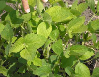 Comparison of staging and pod development of 66 per cent (left) vs 100 per cent (right) defoliation during R3 growth stage of soybean.