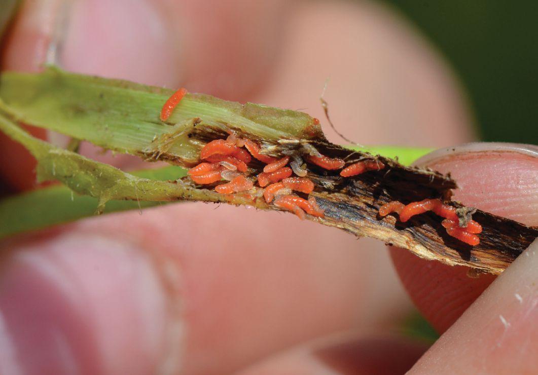 TOP: Larvae of the soybean gall midge feed under the soybean stem’s outer layer.