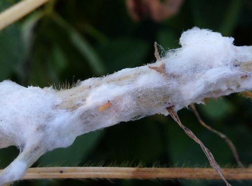 “The soybean gall midge larvae will be found under the soybean stem’s epidermis in an area that is discoloured and sometimes somewhat distorted near the base of the stem.” Koch says. “The whitemold gall midge will be found in association with the white mould on the plant. If you’ve got favourable conditions for that fungus, and you can easily see that white fuzzy stuff on the exterior of the stems or even inside the stems, that is where the white-mold gall midge would be found. If the conditions turn a little drier, sometimes it is not as easy to see the fungus on the plant, and it might not be so obvious that those larvae are in association with the fungus. But even so, the white-mold gall midge larvae are not likely to be at the base of the stem within a necrotic area.”