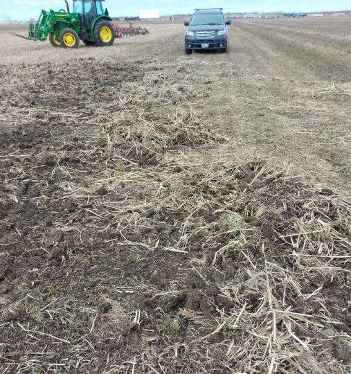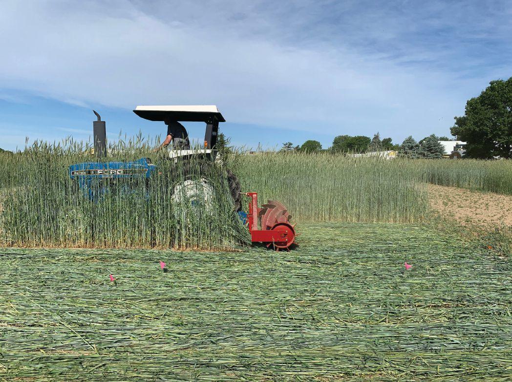 TOP: Roller crimping of cereal rye performed by Jeff McCormick, farm foreman at the AAFC Harrow Research and Development Centre.