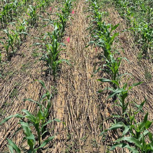 Rye cover crops were terminated via roller crimping when plants reached a stage between 50 per cent anthesis and early milk stage. Brackenridge opted to use three-metre-wide rear tractormounted roller crimpers filled with water. Six days following termination, corn was planted with no-till planters directly into the crimped rye.