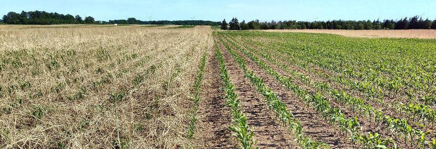 ABOVE: Strip-till with no cover crop (right) on June 17, 2021, compared to a corn field planted into a rye cover crop.