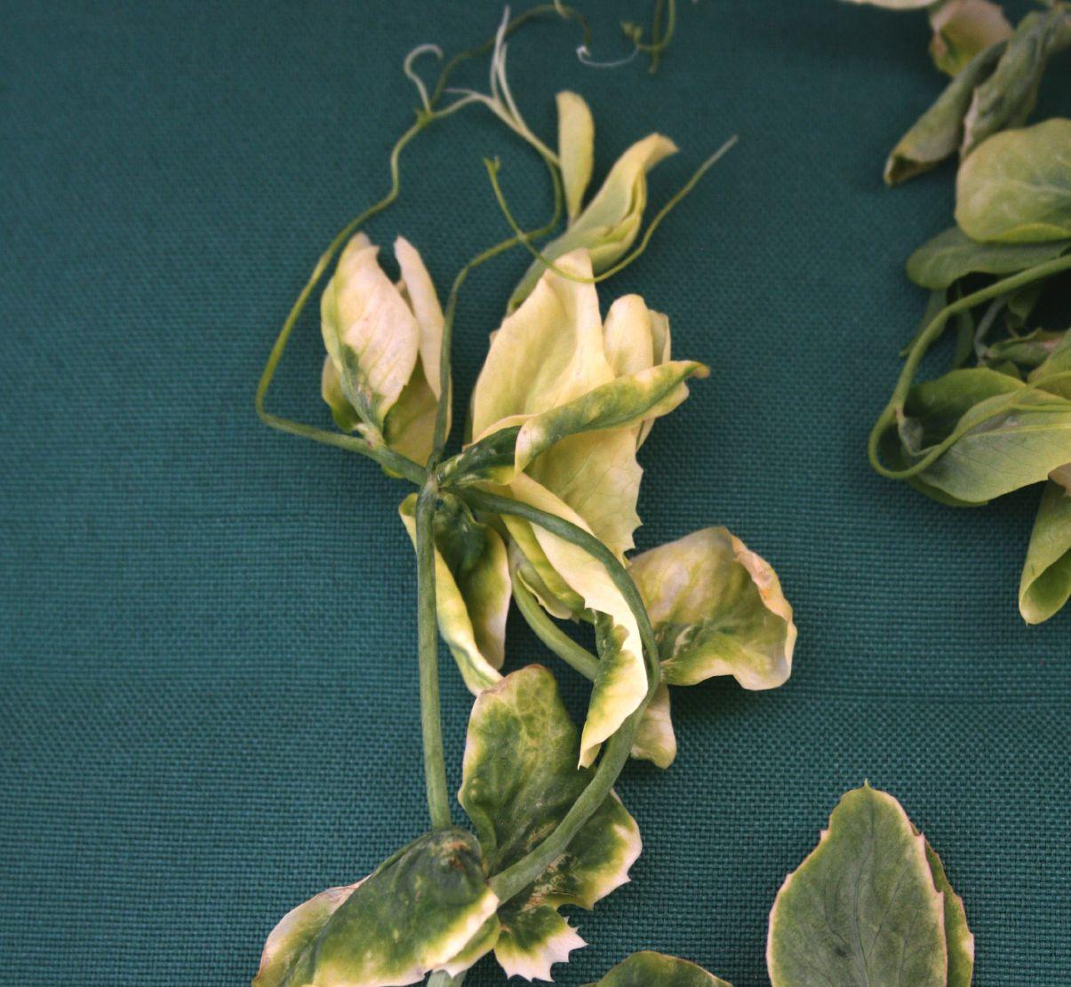 Herbicide carryover can cause damage to crops, as shown in this pea plant.