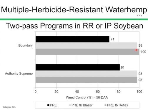 Foliar fungicide was also investigated. In wet seasons, a single application of a foliar fungicide yielded almost 10 bu/ac more, and in dry seasons, there was still a trend to 4.5 bu/ac higher yield.