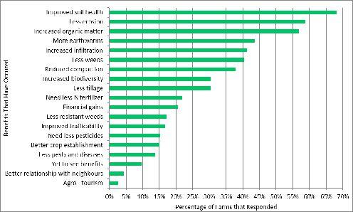 Ninety-one per cent of farmers said they saw at least one benefit from cover crops. The most common was improved soil health. They also said they saw increased biodiversity and organic matter, and less erosion. Some of these benefits increase over time, and others might be seen relatively quickly.