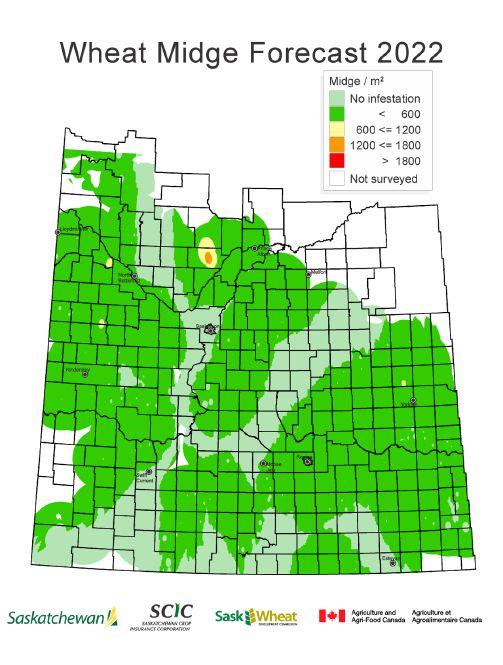 Wheat midge populations were relatively low across the Prairies in 2021, very likely because of low rainfall. The 2022 forecast for Saskatchewan shows a big decrease from 2021. They overwinter as larvae, typically in the soil. They need more than 25 mm of rain prior to the end of May to complete development to adults.