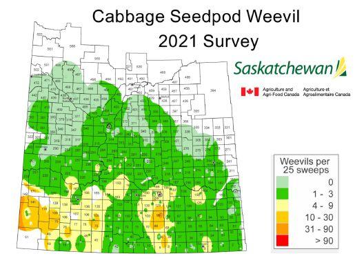 This insect is invasive, and has found its way across the Prairies. The cabbage seedpod weevil range continues to expand north and east from Alberta, and is now found in Manitoba in very low numbers.
