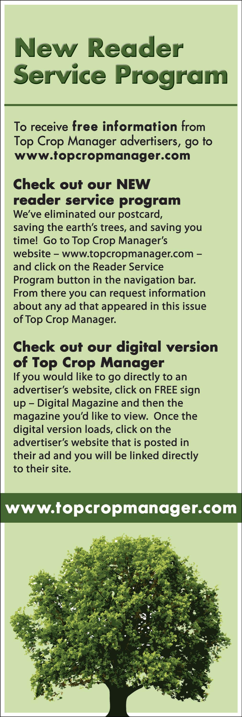 All advertising is subject to the publisher’s approval. such approval does not imply any endorsement of the products or services advertised. Publisher reserves the right to refuse advertising that does not meet the standards of the publication. www.topcropmanager.com
