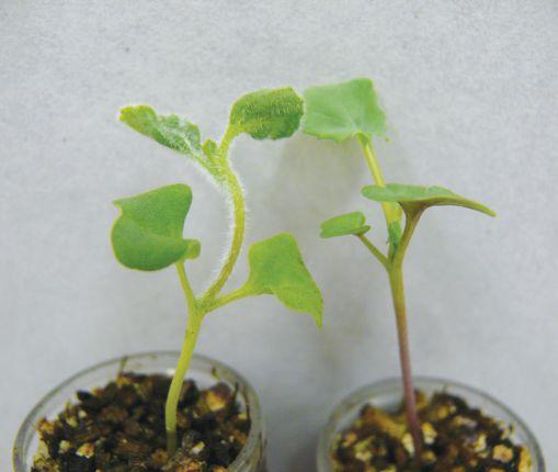 Comparison of a hairy canola seedling with an unmodified canola seedling.