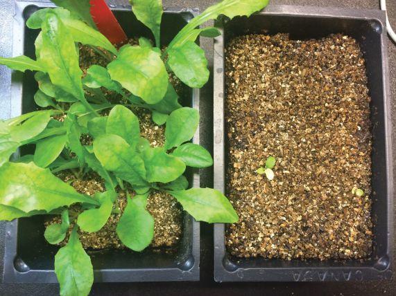 <LEFT: (Top to bottom) Dandelion untreated with Phoma macrostoma, dandelion after one post-emergent application, and dandelion after two post-emergent applications.