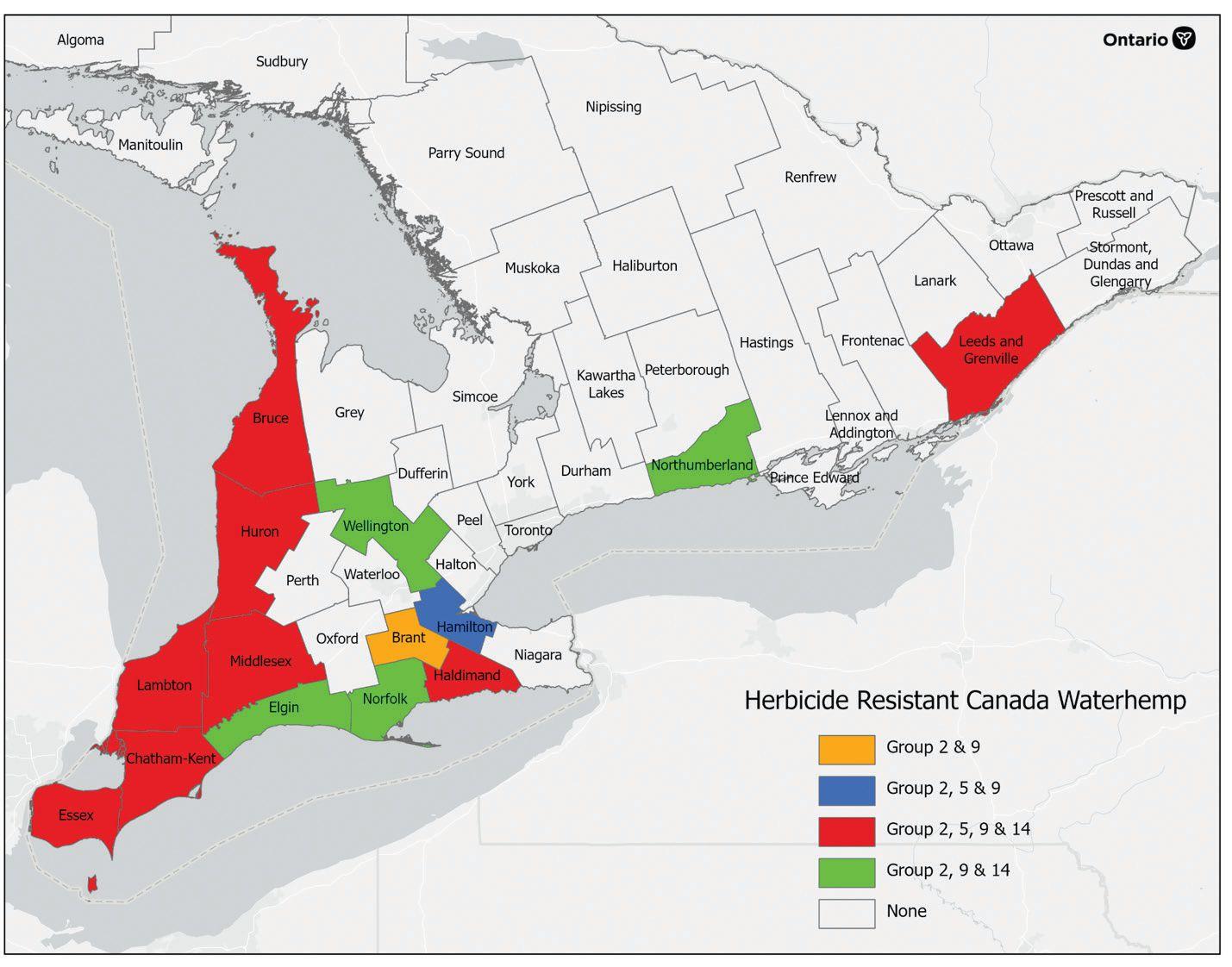 Graphic shows the spread of herbicide-resistant waterhemp in Ontario. Counties in red have Group 2, 5, 9 and 14 resistant populations.