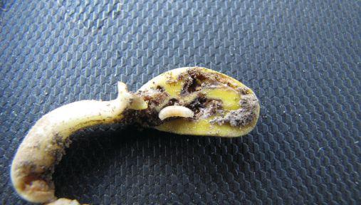 Seed corn maggots are small, light yellow maggots that feed on germinating soybean and corn seeds. Because adult flies will only lay eggs in moist, rotting vegetation and larvae need time to do maximum feeding, seed corn maggots are most damaging in cool, wet, slow springs.
