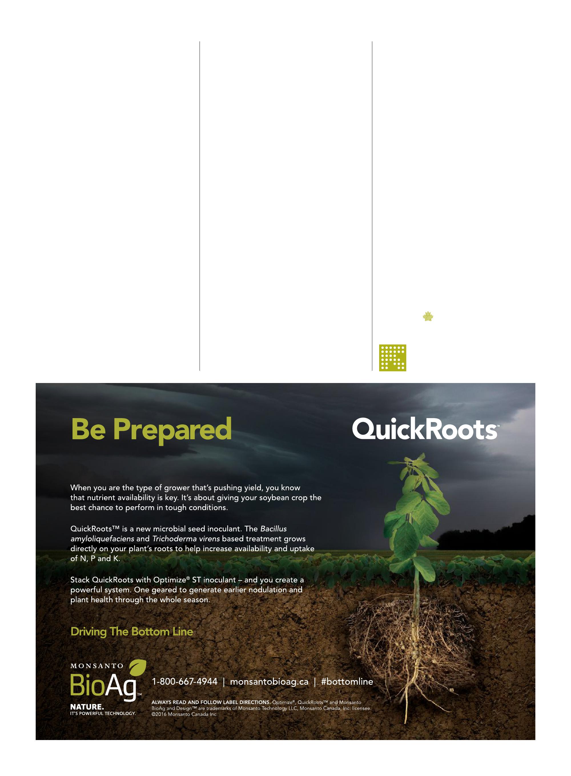 ALWAYS READ AND FOLLOW PESTICIDE LABEL DIRECTIONS. Roundup Ready® technology contains genes that confer tolerance to glyphosate, an active ingredient in Roundup® brand agricultural herbicides. Roundup Ready 2 Xtend™ soybeans contain genes that confer tolerance to glyphosate and dicamba. Agricultural herbicides containing glyphosate will kill crops that are not tolerant to glyphosate, and those containing dicamba will kill crops that are not tolerant to dicamba. Contact your Monsanto dealer or call the Monsanto technical support line at 1-800-667-4944 for recommended Roundup Ready ® Xtend Crop System weed control programs. Acceleron® seed applied solutions for canola contains the active ingredients difenoconazole, metalaxyl (M and S isomers), fludioxonil and thiamethoxam. Acceleron® seed applied solutions for canola plus Vibrance ® is a combination of two separate individually-registered products, which together contain the active ingredients difenoconazole, metalaxyl (M and S isomers), fludioxonil, thiamethoxam, and sedaxane. Acceleron® seed applied solutions for corn (fungicides and insecticide) is a combination of four separate individuallyregistered products, which together contain the active ingredients metalaxyl, trifloxystrobin, ipconazole, and clothianidin. Acceleron® seed applied solutions for corn (fungicides only) is a combination of three separate individually-registered products, which together contain the active ingredients metalaxyl, trifloxystrobin and ipconazole. Acceleron® seed applied solutions for corn with Poncho ®/VoTivo™ (fungicides, insecticide and nematicide) is a combination of five separate individually-registered products, which together contain the active ingredients metalaxyl, trifloxystrobin, ipconazole, clothianidin and Bacillus firmus strain I-1582. Acceleron® seed applied solutions for soybeans (fungicides and insecticide) is a combination of four separate individually registered products, which together contain the active ingredients fluxapyroxad, pyraclostrobin, metalaxyl and imidacloprid. Acceleron® seed applied solutions for soybeans (fungicides only) is a combination of three separate individually registered products, which together contain the active ingredients fluxapyroxad, pyraclostrobin and metalaxyl. Acceleron®, Cell-Tech™, DEKALB and Design®, DEKALB®, Genuity and Design®, Genuity ® JumpStart ®, Optimize ®, RIB Complete ®, Roundup Ready 2 Technology and Design®, Roundup Ready 2 Xtend™, Roundup Ready 2 Yield®, Roundup Ready ®, Roundup Transorb ®, Roundup WeatherMAX®, Roundup Xtend™, Roundup ®, SmartStax®, TagTeam®, Transorb ®, VaporGrip ®, VT Double PRO ® VT Triple PRO ® and XtendiMax ® are trademarks of Monsanto Technology LLC. Used under license. Fortenza® and Vibrance ® are registered trademarks of a Syngenta