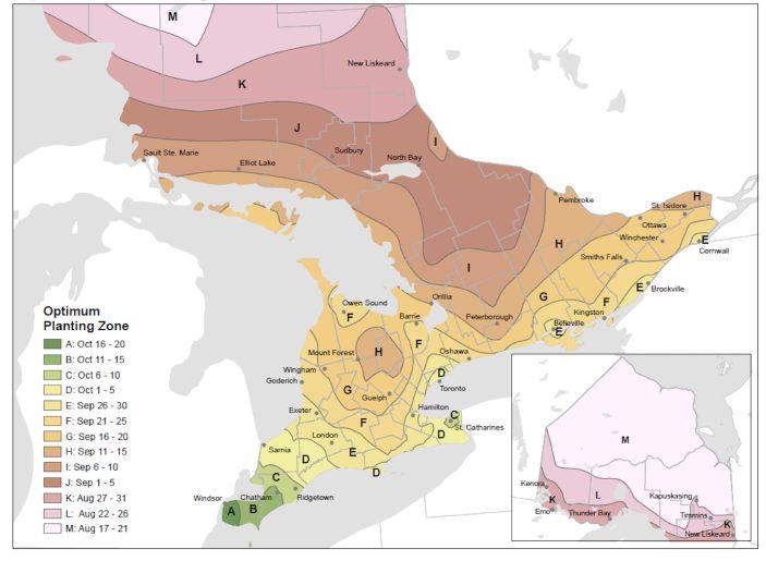 For most of Ontario the optimal seeding date is generally from mid- to lateSeptember. In northern Ontario, we want to be as early as late August, so August 31 for the north. Whereas if you go into the deep south of Ontario, particularly in Essex County, it’s early to mid-October,