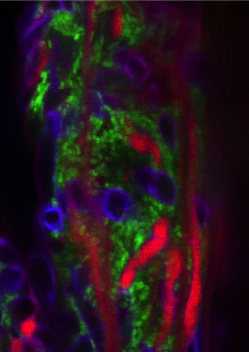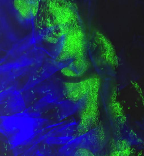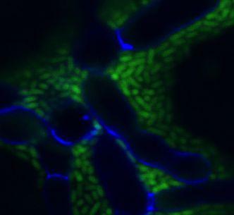 M6 cells (green) surround Fusarium strands (blue, in cross section), on a microscope slide in the absence of a plant.