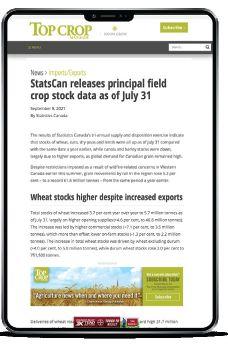 The results of Statistics Canada’s tri-annual supply and disposition exercise indicate that stocks of wheat, oats, dry peas and lentils were all up as of July 31 compared with the same date a year earlier, while canola and barley stocks were down, largely due to higher exports, as global demand for Canadian grain remained high. TopCropManager.com