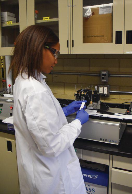 Fiona Ebanks preparing the mycotoxin test kits with the BioDot printer and lateral flow assay in the LADDER. The test kits are being manufactured and assembled in the lab before largescale commercialization will take place.