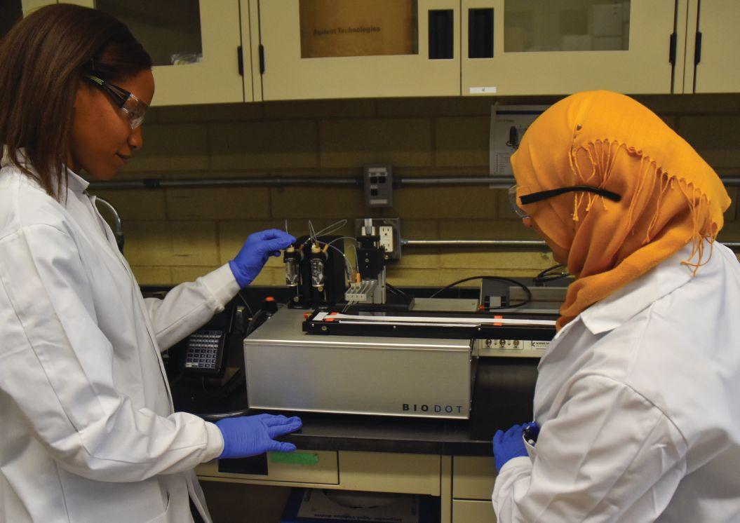 ABOVE: Fiona Ebanks and Shahad Abdulmawjood setting up the BioDot printer for producing the mycotoxin test kits in the Laboratory for Aptamer Discovery and Development of Emerging Research (LADDER) at Carleton University.