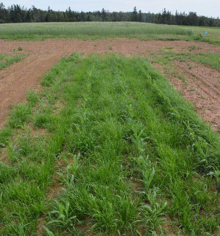 ABOVE Annual ryegrass growing between corn rows in McKenzieGopsill’s trial.