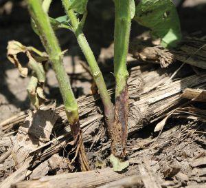 He notes, “The adults lay their eggs at the base of soybean stems. We suspect that they are laying their eggs into cracks in the stem. Then the larvae get into the stem and feed under the stem’s epidermis, its outer layer.”