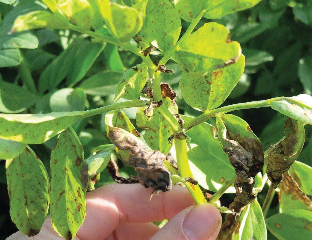 ABOVE: Smaller pinpoint lesions caused by Botrytis cinerea in fababean field.