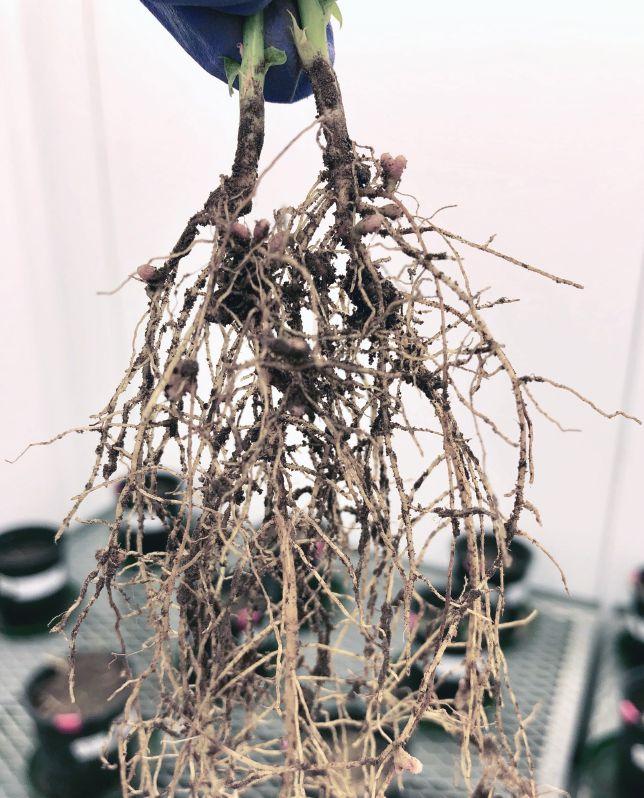 “By the time we did this step about three times, we began getting nodules that were looking pink and bigger,” he says. “Somewhere around cycle five, we were starting to get large, effectivelooking nodules that were clustered on the roots right below the crown, and the plants looked really healthy and green. The change was very striking.”