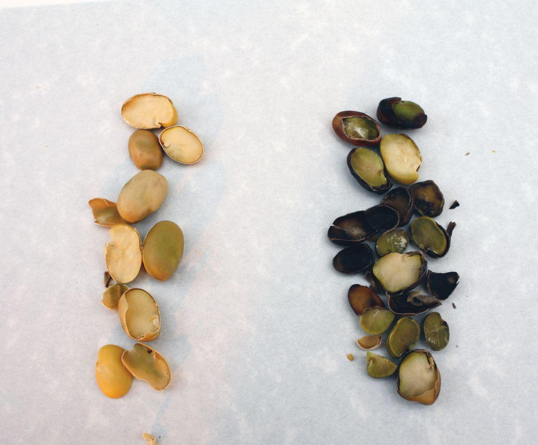 ABOVE: Undamaged (left) and frost damaged fababean.