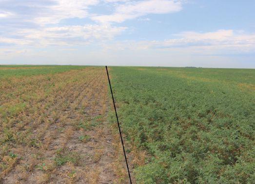 ABOVE: Strydhorst’s study found that field pea planted between rows of tall standing wheat stubble (right) had better standability than pea planted into no standing stubble (left).