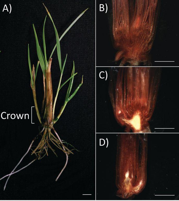 Assessing winter wheat recovery from freezing. A) Winter wheat plant recovering from freezing injury that has developed new shoots and roots (white). B) Uninjured winter wheat crown stained with tetrazolium chloride. C) Winter wheat crown with injured vascular transition zone and meristem in a secondary tiller. D) Crown with injury to the vascular transition zone, tiller meristem and apical meristem. Injury depicted in D) is lethal. Scale bar = 0.6 cm.