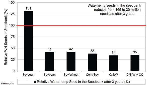 Looking at waterhemp seed in the seedbank, continuous soybean actually had an increase of 31 per cent. But more diverse rotations with a greater number of modes-of-action had reductions of up to 66 per cent.