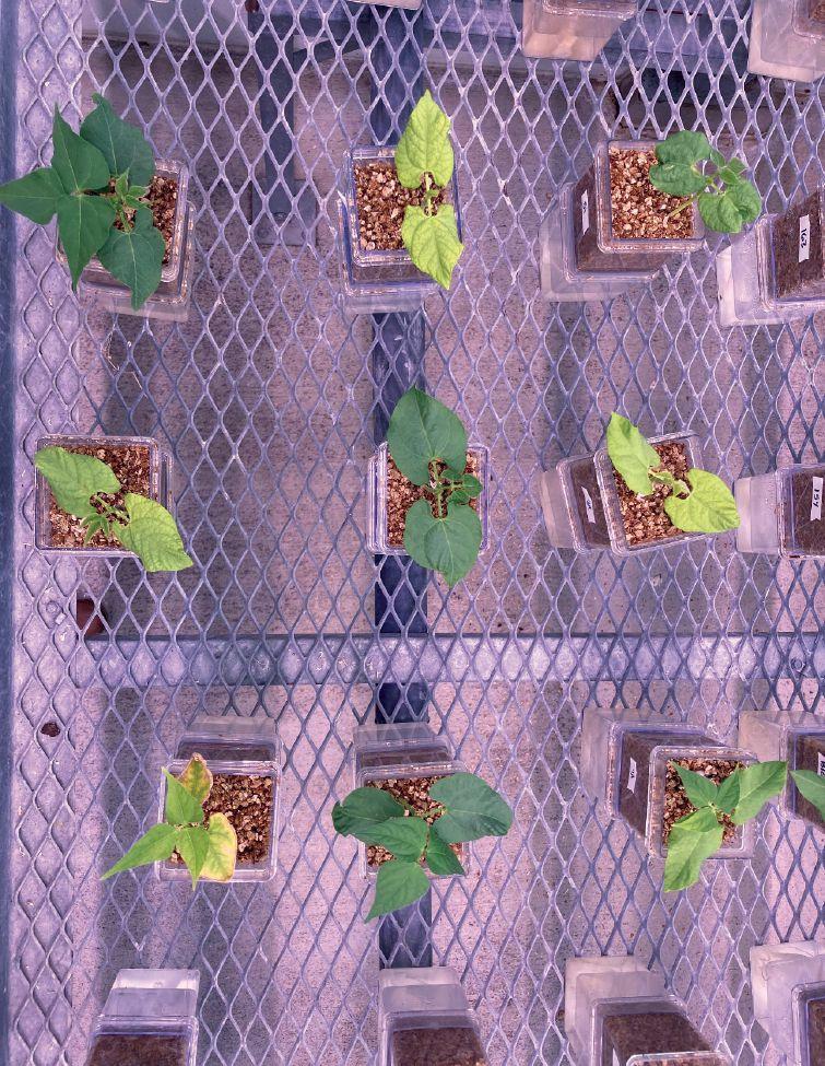 LEFT These navy bean plants in the Queen’s University greenhouse are growing in pots containing rhizobia from Ontario soils but no added nitrogen, so the plant growth depends on successful nitrogen fixation by the rhizobia.
