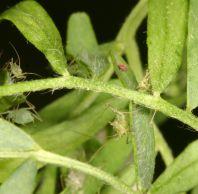 Aphids will cause damage by sucking plant sap. Infested plants may exhibit yellow leaves and stunted growth. Adults and nymphs found feeding during flowering or early pod stage may reduce seed size and formation. They can also transmit pea seed-borne mosaic virus, further damaging crops. On alfalfa, pea aphid feeds on stems and newly expanding leaves.