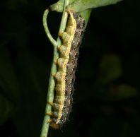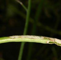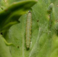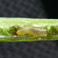 In canola, larvae debark pods, chew through to eat the seeds or can entirely consume pods when populations are high. Stripped pods may shatter prematurely, and crops can look white in colour. In flax, flowers and developing bolls are cut.