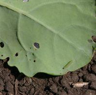 During crop emergence, look for thinning or bare areas of the field. Scout in the early morning or evening for cutworms feeding above-ground. At 10 sites in a field, count larvae in the top 2.5 cm (1 in.) of topsoil in a 0.1 m2 (1 ft2) area.