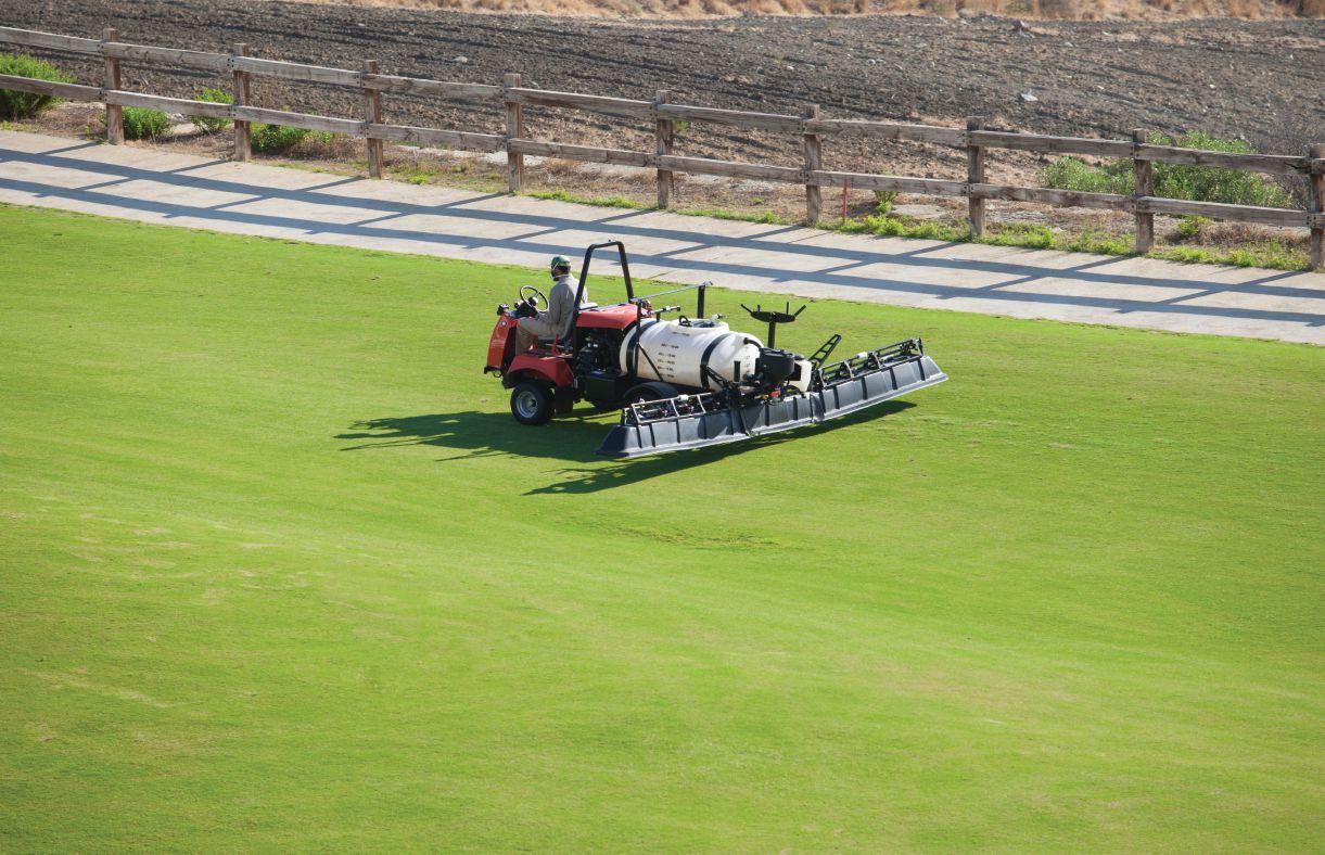A sprayer at work on a golf course fairway. Regular cleaning of sprayers is the key to its return on investment and ensures there are no issues with the product being applied.