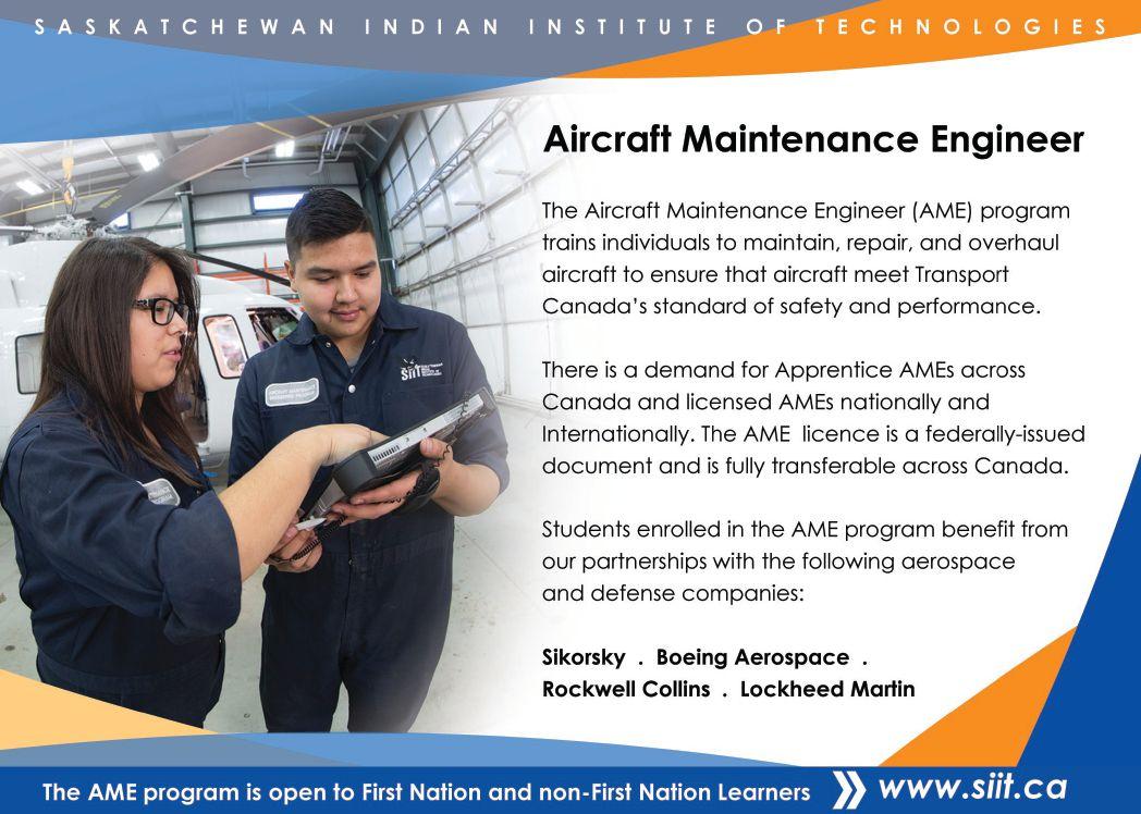 Students meeting the Transport Canada (TC) accreditation requirements receive 18 month credit towards the experience requirements for issue of an Aircraft Maintenance Engineer (AME) Licence (M or E rating), and TC technical examination credit. The programs are also accredited by The Canadian Council for Aviation and Aerospace (CCAA) as meeting the national occupational standards for aircraft/avionics maintenance training.
