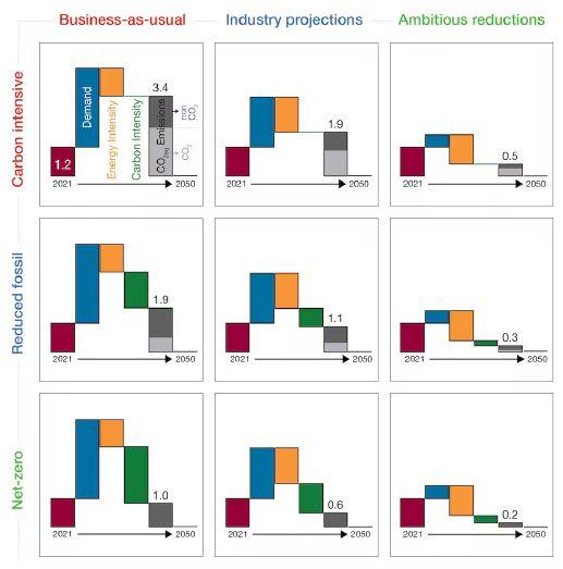 Nine scenarios illustrate how much carbon offsets would be required to reach net-zero emissions, depending on choices made about demand and energy and carbon intensity. Each starts with 2021’s emissions (1.2 gigatons of carbon dioxide equivalent). With rising demand and no improvement in carbon intensity, a large amount of carbon capture will be necessary. Less fossil fuel use and slower demand growth reduce offset needs.