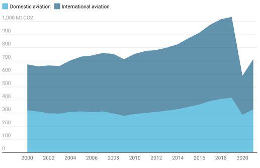 Carbon dioxide emissions from domestic and international flights were rising until the pandemic began in 2020 and demand dropped. Emissions have since begun to rebound.