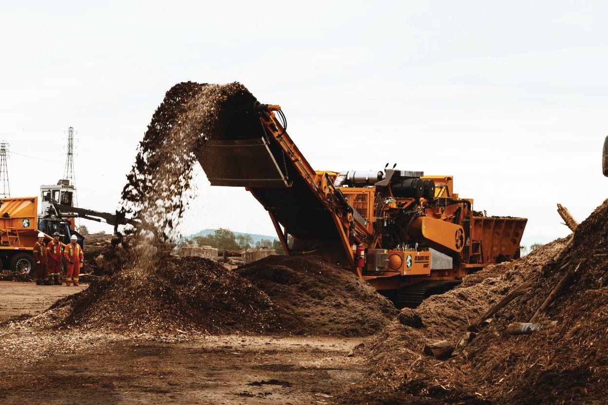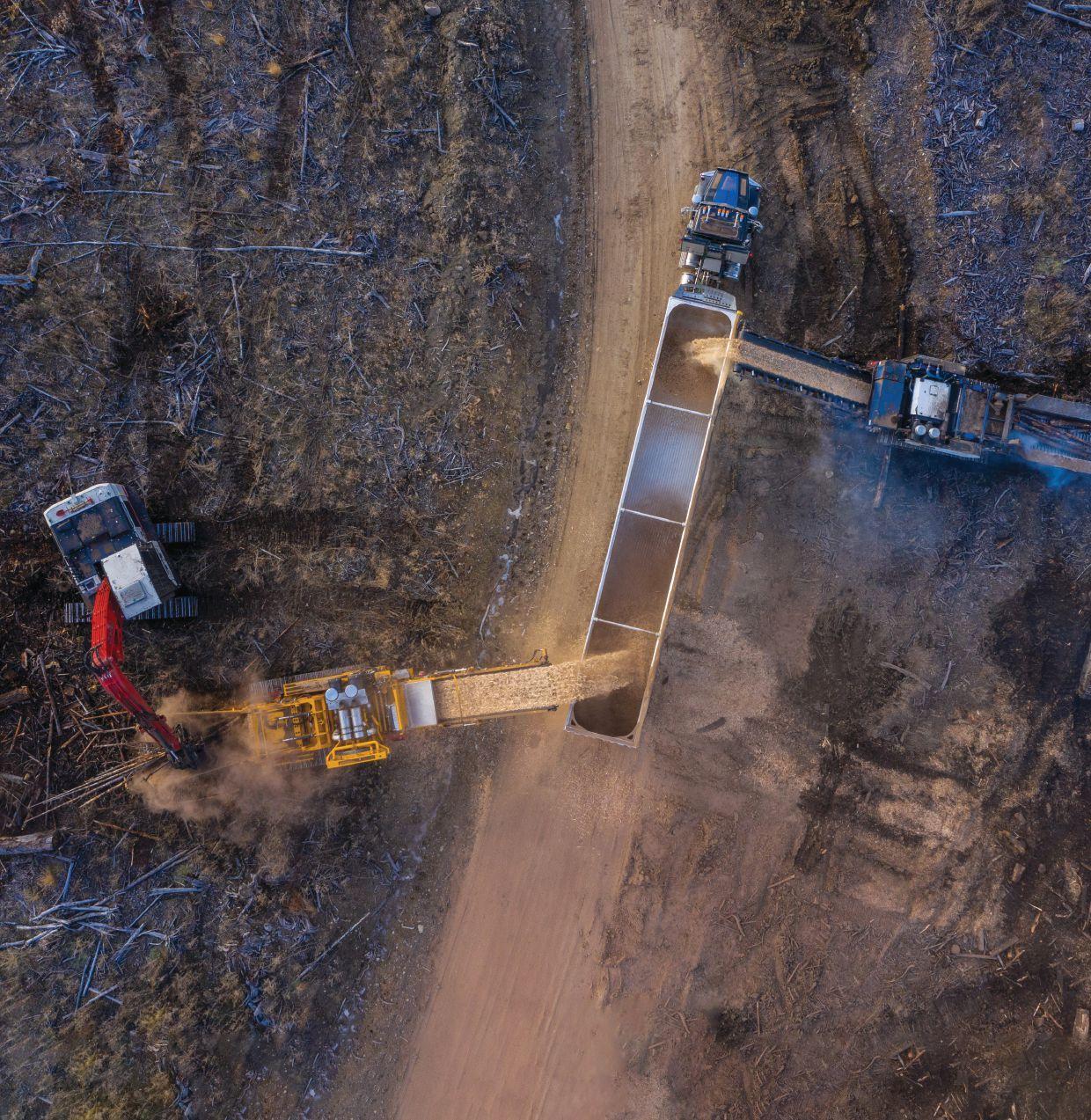 Tsi Del Del Enterprises and Borland Creek Logging workers are grinding slash piles roadside and transporting the wood chips to nearby Atlantic Power and Pinnacle Renewable Energy’s Williams Lake, B.C., pellet plant. Photo by Mitch Cheek, Solos Productions. Read the story on page 10.