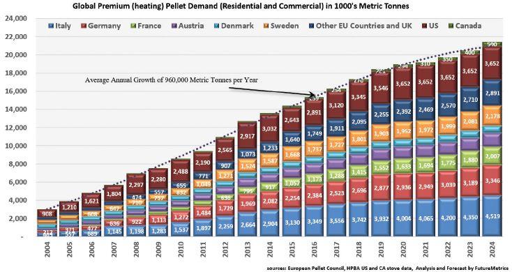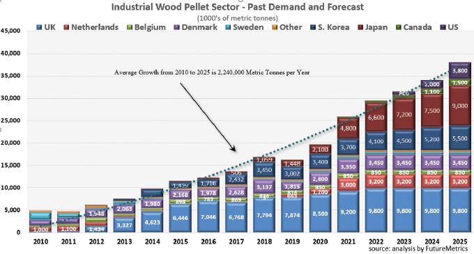 The heating pellet sector is substantial and is expected to grow significantly. Chart 1 shows the historic global demand and FutureMetrics’ forecast demand for heating pellets under current policy.