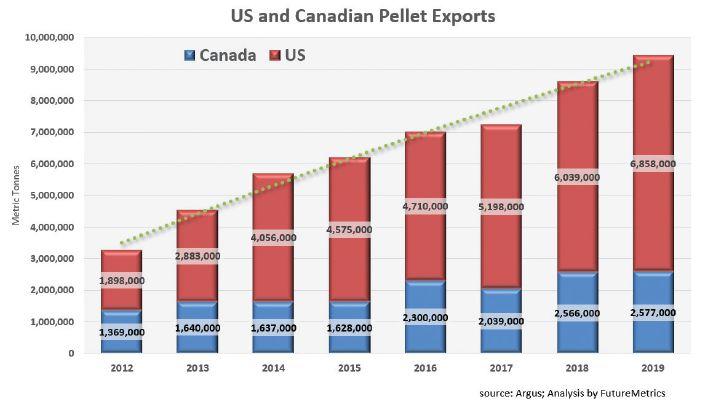 Global wood pellet markets have had significant growth in the past decade. Between 2012 and 2018, the global wood pellet market has experienced growth rates averaging 11.6 per cent annually, from about 19.5 million (metric) tonnes in 2012 to about 35.4 million tonnes in 2018. From 2017 to 2018 alone, wood pellet production increased by 13.3 per cent.