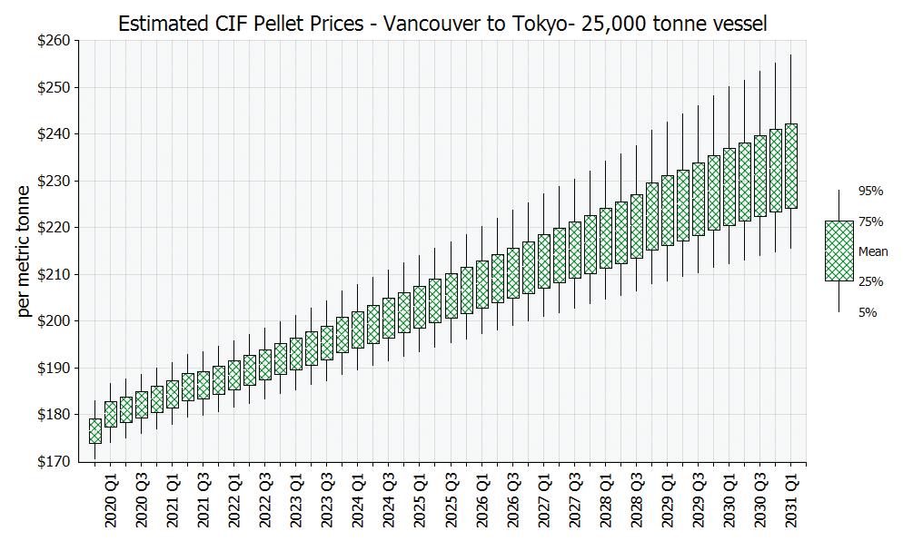 The methodology of estimating expected future CIF prices involves developing independent forecasts for each of the main components of pellet costs: wood costs delivered to the pellet mill; pellet mill conversion costs (excluding wood costs); pellet producers’ expected margins (using EBITDA per tonne as the model input); inland transportation from the mill to the port, and port storage and loading costs; and shipping.